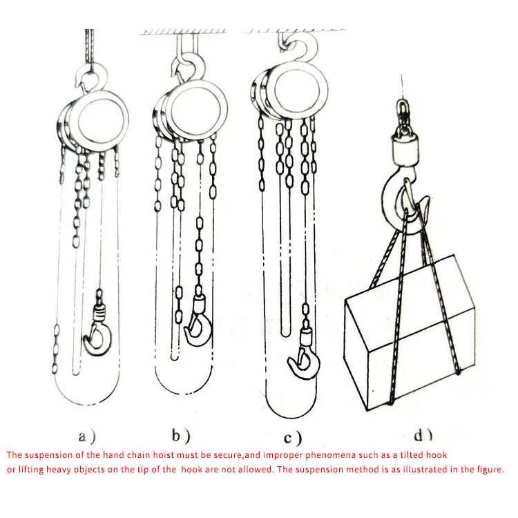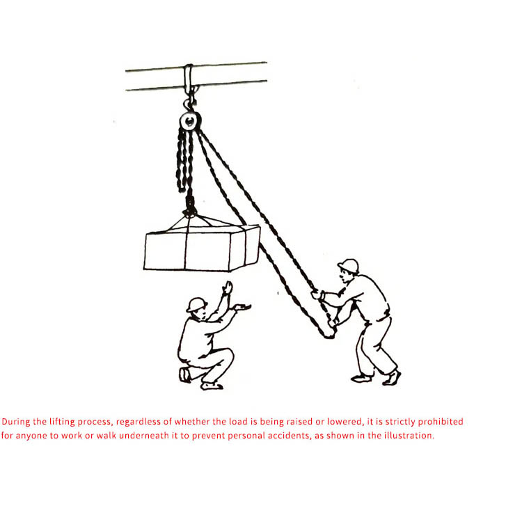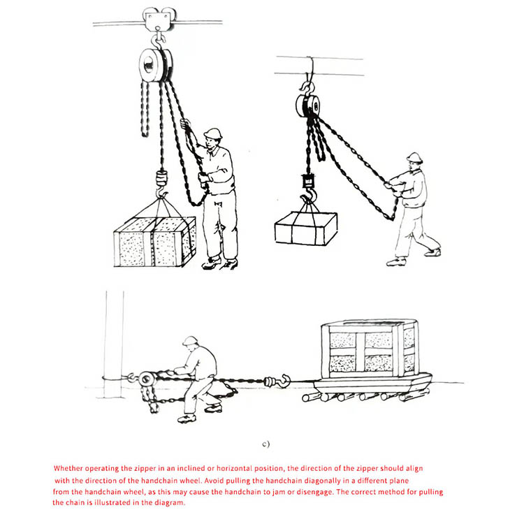 Helyes húzás: A kézi láncot simán és függőlegesen húzza a lánc iránya mentén; ne húzza ferdén, és ne húzzon több embert erővel.